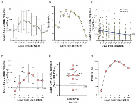 Monitoring of SARS-CoV-2 RBD specific antibodies through ELISA in Group 1 (n = 116) and Group 2 (n = 96). (A) Curve of RBD specific antibodies in SARS-CoV-2 naturally infected individuals (Group 1); (B) Percentage of seroconversion in SARS-CoV-2 infected individuals (Group 1); (C) Linear regression analysis of anti-RBD antibodies over 12-months from the day of infection by SARS-CoV-2 (Group 1); (D) Curve of RBD specific antibodies in CoronaVac vaccinated individuals (Group 2); (E) Distribution of OD means post vaccination (Group 2); (F) Percentage of seroconversion in CoronaVac vaccinated individuals (Group 2).