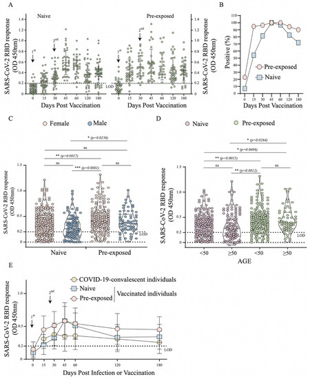 Profile of RBD specific antibody response in individuals after vaccination with CoronaVac vaccine through ELISA in Group 2 (n = 96). (A) Distribution of OD values per day in Dotplot of the vaccinated naïve and SARS-CoV-2 pre-exposed individuals; (B) Percentage de seroconversion of vaccinated naïve and SARS-CoV-2 pre-exposed individuals; (C) Comparative analysis of OD values in vaccinated naïve and SARS-CoV-2 pre-exposed individuals by gender (female and male). (D) Comparative analysis of OD values in vaccinated naïve and SARS-CoV-2 pre-exposed individuals by age group (<50 and ≥50), (E) Curve of RBD specific antibodies in COVID-19-convalescent (Group 1), vaccinated naïve and pre-exposed individuals. *—p < 0.05; **—p < 0.01; ***—p < 0.001; ns—p ≥ 0.05.