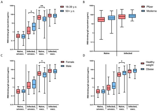 Magnitude of initial seroconversion based on demographic information. (A) Differences between young (18–39 y.o.) and older (50+ y.o.) participants were significant in infected, unvaccinated (* p = 0.0334) and naïve, vaccinated (** p = 0.0038) groups. (B) Differences between Pfizer and Moderna vaccinees were not significant. (C) Differences between females and males were significant in the naïve, vaccinated (* p = 0.0438) group. (D) Differences between participants with a healthy weight (BMI = 18.5–24.9) and those who were obese (BMI ≥ 30) were significant in the naïve, vaccinated group (* p = 0.0119). Initial seroconversion is designated by timepoints 0.5–1 month after COVID-19 infection or the reception of the primary vaccine series (2 × mRNA or 1 × viral vector).