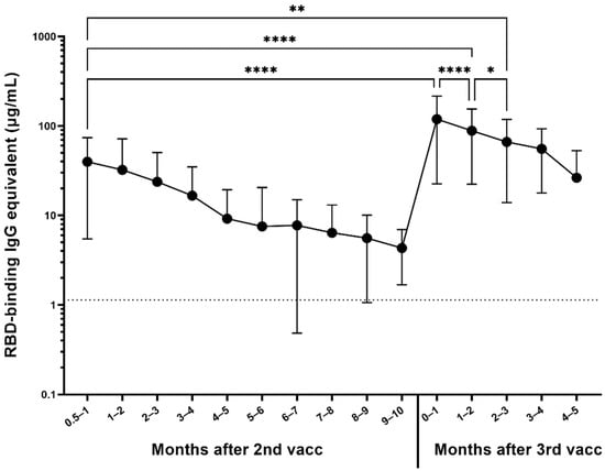 Antispike antibodies increase significantly following vaccination [10,11]. However, there is a significant drop in antibody levels within the first few months following vaccination [12,13,14]. In order to keep the level of circulating antibodies high, a third (booster) dose of the Pfizer–BioNTech and Moderna vaccines was approved in the USA during the second half of 2021 [15]. While all Pfizer–BioNTech vaccine doses—including the third (booster) dose—contain 30 µg mRNA, the primary Moderna vaccine series contains 100 µg each, and the booster dose contains only 50 µg [5,9,15,16].