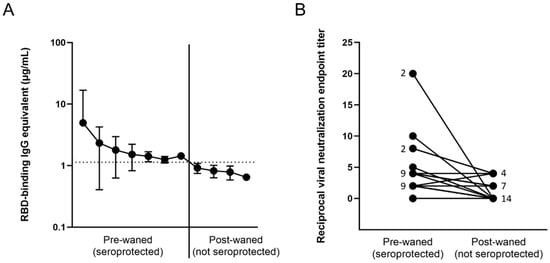 Loss of antibody-protected status based on (A) antibody binding, and (B) viral neutralization in waned participants. (A) All 25 participants demonstrated a loss of anti-RBD binding antibodies; (B) only 13 showed a loss of neutralization potential, signified by an initial non-0 neutralization endpoint titer and an endpoint titer of 0 at the post-waned timepoint. The numbers next to the dots represent the number of overlapping participants with the same neutralizing endpoint titer.