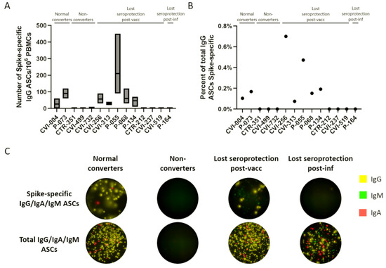 The number of ASCs was enumerated using a FluoroSpot assay. The number of spike-specific ASCs out of 106 PBMCs was between 0 and 210 (Figure 5A), which represents 0–0.7% of total ASCs (Figure 5B). The majority of secreted immunoglobulins for each sample was IgG, and the spike-specific and total IgG/IgA/IgM ASCs of selected participants from each of the four groups are represented in Figure 5C. The only differences between the post in vitro differentiation ELISA results and the FluoroSpot results were three participants who had detectable total IgG antibodies by ELISA but no detectable ASCs by FluoroSpot. The antispike antibodies correlated with the presence/absence of spike-specific ASCs in all cases, but CVI-237, CVI-256, and CVI-519 showed a dissimilarity with the results of an earlier experiment using a different PBMC vial.