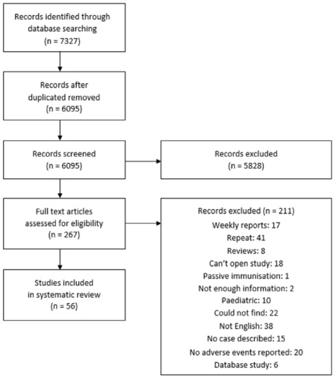 Overall, 7327 studies were found on the PubMed, Embase, and Scopus databases (Figure 1). After removing duplicates, 6095 studies were screened by title and abstract for any cardiac AEs after vaccination. A total of 267 studies qualified and were opened for a full-text review. A final selection of 56 studies was selected for adverse cardiac events after vaccination, with a total of 340 patients. Eleven studies described cardiac AEs following influenza vaccination [10,11,12,13,14,15,16,17,18,19,20], and 18 studies described cardiac AEs after COVID-19 vaccination [6,7,8,9,21,22,23,24,25,26,27,28,29,30,31,32,33,34,35]. There were 20 studies reporting cardiac AEs after smallpox vaccination [36,37,38,39,40,41,42,43,44,45,46,47,48,49,50,51,52,53,54,55]. Among other vaccines, there were two reports of cardiac AEs after pneumococcal vaccination [56,57], three reports of cardiac AEs after tetanus toxoid [58,59,60], one report following cholera vaccination [61], and one report following rabies vaccine [62].