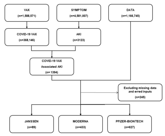 The flow diagram of the study. A total of 1394 AKI cases were found after the administration of the COVID-19 vaccine. After combining with patient data and excluding missing data and erred inputs, 1149 AKI cases were finally selected in this study. Of these, 627 (54.6%) cases were reported following the Pfizer-BNT COVID-19 vaccine, and 433 (37.7%) were reported after the Moderna vaccine.
