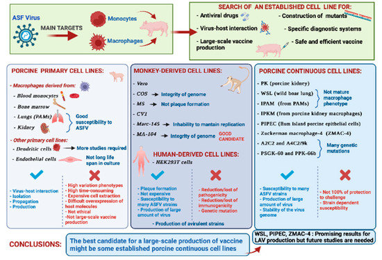 | WSL | Wild boar (fetus) [20,30,116] | Lung [20,30,116] | Spontaneously immortalized cell line [130] | - CC83, Malawi 82, Uganda, Lisbon 57, E70 [30] -ASFV-Kenya1033-IXL [118] | - NH/P68 [18,115] - ΔEP153R, Hinde attenuated, Uganda attenuated NH/P68, BA71V [30] - NHV-dTK-EGFP [116] - ASFV-KeΔA238L strain (generated by deletion of the gene A238 by ASFV-Kenya1033- IXL) [119] - OUTR88/3 [102] | - ASFV-Kenya1033-IXL and ASFV-KeΔA238L → genomic stability during passages in WSL [118,119] - NH/P68 ASFV strain produced in WSL cells (10 passages) → in vivo in pigs induced a similar infection pattern to that of NH/P68 passaged in PAM [18,115] - ASFV-Kenya-1033-IX produced in WSL cells (more than 20 passages) → retained the virulence in vivo [118] | - Slight or unnoticeable cytopathic effects [20,30] - No ability to efficiently support the growth of E70 or Armenia/07 [18,115]. - Promising results, but in vivo studies are required to evaluate its suitability to grow ASFV strains for large-scale vaccine production (protection to challenge). |