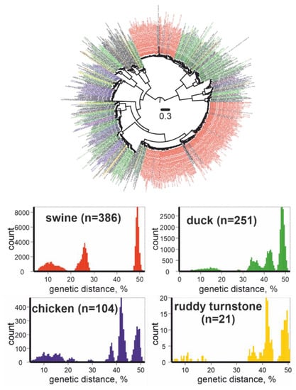 Upper panel: Unrooted maximum likelihood tree for IAVs (HA gene fragment, n = 1003). Red color indicates viruses collected from swine, green from ducks, blue from chickens, yellow from ruddy turnstones. Phylogenetic inference was performed using IQ-TREE []. Lower panel: pairwise genetic distances for IAVs collected from swine, ducks, chickens, and ruddy turnstones.