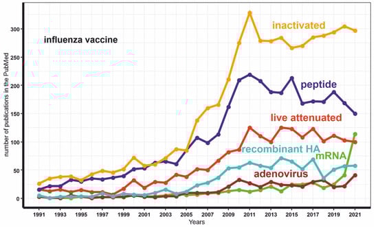The dynamics of the publications number with keywords “mRNA INFLUENZA VACCINE” or “live attenuated INFLUENZA VACCINE” or “inactivated INFLUENZA VACCINE” or “adenovirus INFLUENZA VACCINE” or “peptide INFLUENZA VACCINE” or “recombinant HA INFLUENZA VACCINE”.
