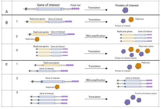 mRNA vaccines’ method of action []. Five-prime cap (black circle) and polyA tail present on all mRNAs. (A), conventional mRNA encodes protein that may be used as an antigen.Apart from the gene of interest, self-amplifying mRNA (SAM) may encode RNA dependent RNA polymerase (RDRP) at the same molecule (B) or at the other mRNA (C). (B,C), step 1, translation of RDRP and gene of interest. Step 2, RDRP amplifies mRNA. Step 3, translation of self-amplified mRNA. Figure was created using BioRender tool.