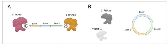 CircRNA protection from exonuclease action. (A) Linear mRNA can be degraded by 5’ RNAse and 3’ RNAse. (B) Circular mRNA cannot be degraded by 5’ RNAse and 3’ RNAse. Figure was created using BioRender tool.