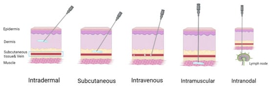 There are different administration routes (Figure 7) for mRNA-based therapeutics []. Systemic intravenous administration often leads to the accumulation of LNPs in the liver. This is acceptable for replacement therapies and for the production of specific anti-pathogen or anti-cancer antibodies due to inherent liver capability for protein secretion. Otherwise, intravenous delivery may cause a wide distribution of nanoparticles through the lymph nodes, enhancing immune response to the antigen, compared with local administration; this could cause adverse effects, therefore using targeted nanoparticles is preferable. Direct local administration (intramuscular, intradermal, subcutaneous) of mRNA-containing nanoparticles into the target tissue is preferential for achieving a local therapeutic effect and a systemic effect through the recruiting of local antigen presenting cells. Local injection is commonly used for vaccination purposes. Van Lint et al., have shown that direct intranodal administration of tumor-associated antigen mRNA together with mRNA coding for immunomodulatory proteins causes a robust T cell response mediated by dendritic cell mRNA uptake, translation, and antigen presentation []. At the same time, intranodal delivery of mRNA-encoded influenza nucleoprotein activates an effective cross-strain T cell response in mice [].
