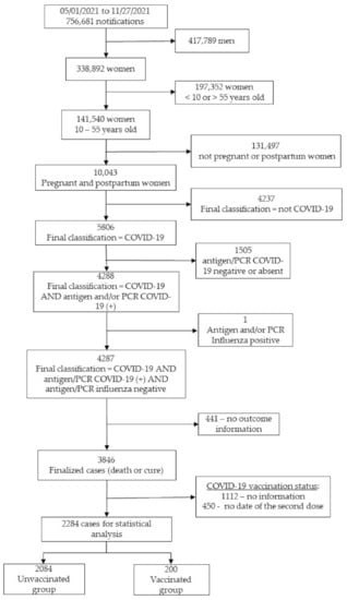 Patients were selected according to the following inclusion criteria: pregnant and postpartum women of childbearing age (10–55 years old), COVID-19 disease confirmed by positive reverse transcription–polymerase chain reaction (RT-PCR) SARS-CoV-2 or antigen, the exclusion of influenza infection by negative RT-PCR or antigen for influenza, availability of the outcome (recovery or death), and the reliability of vaccination status. Since this was a retrospective study, no exclusion criteria were determined.
