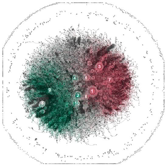 - Bastian, M.; Heymann, S.; Jacomy, M. Gephi: An Open Source Software for Exploring and Manipulating Networks. Proc. Int. AAAI Conf. Web Soc. Media 2009, 3, 361–362. [Google Scholar]