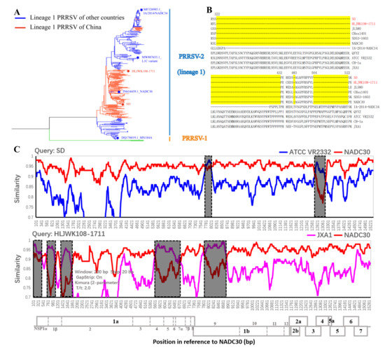 - Liu, J.; Zhou, X.; Zhai, J.; Wei, C.; Dai, A.; Yang, X.; Luo, M. Recombination in JXA1-R vaccine and NADC30-like strain of porcine reproductive and respiratory syndrome viruses. Vet. Microbiol. 2017, 204, 110–120. [Google Scholar] [CrossRef]