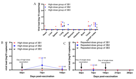 Over the course of the study, the piglets in high-dose group of 3B1–3B3 and repeated-dose group of 3B1–3B3 had no clinical signs of PRRSV and no fever (data not shown). To evaluate viremia and the distribution of PRRSV in different tissues, the serum samples and ten organ tissues were evaluated by real-time PCR, which were collected either from 0, 7, 14 dpv in high-dose groups or from 0, 7, 14, 21 and 28 dpv in repeated-dose groups. The low-level viral copy of the serum samples at 7 or 14 dpv (2 out of 5 piglets at 7 dpv and 1 out of 5 piglets at 14 dpv of the high-dose group of 3B2; 1 out of 5 piglets at 7 dpv of high-dose group of 3B3; 1 out of 5 piglets at 7 dpv of the repeated-dose group of 3B1) were detected (Figure 2B,C). In addition, the low-level viral copy was detected in lungs, tonsils, lymph nodes, and a small amount of tissues (heart and spleen in the high-dose group of 3B1; kidney in high-dose group of 3B3) (Figure 2A).
