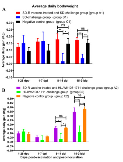 Effects after SD−R immunization and challenge with parental virus SD (A) and NADC30−like PRRSV HLJWK108−1711 (B) on the weight of the piglets. All the experimental piglets were weighed at 0 and 28 dpv and 7, 14, and 21 dpi. The average daily gain of 5 or 3 piglets per group was calculated for days 0 to 28 dpv and 1 to 7 dpi, 8 to 14 dpi, and 15 to 21 dpi. The bars represent the average daily body weight of five or three piglets ± SD. An asterisk (*) indicates a significant difference between the group A1 and B1, B1 and C1 or the group A2 and B2, B2 and C2 (****, p < 0.0001; ***, p < 0.001; **, p < 0.01; *, p < 0.05; ns, p > 0.05). Groups A1, B1, and C1 are labelled red, blue, and black, respectively. Groups A2, B2, and C2 are labelled purple, green, and orange, respectively.
