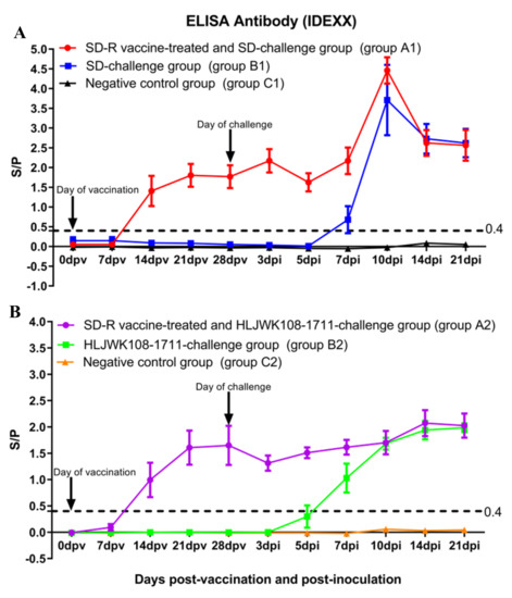 Serum samples were collected at 0, 7, 14, 21, and 28 dpv and 3, 5, 7, 10, 14, and 21 dpi. PRRSV-specific antibodies were measured using a commercial ELISA kit (IDEXX, Inc., Westbrook, ME, USA) according to the manufacturer’s instructions. The PRRSV-specific antibody titer was reported as the S/P ratio, and the serum samples were considered positive if the S/P ratio was ≥ 0.4.
