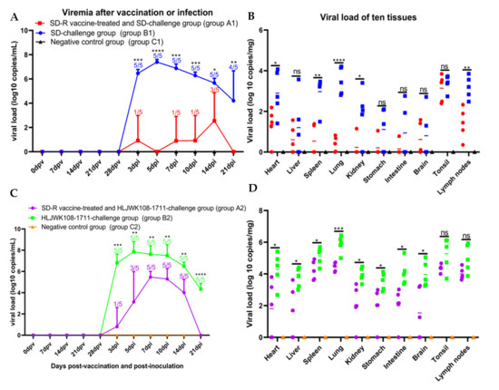 Viremia and viral loads in ten tissues after SD-R immunization and challenge with parental virus SD ((A) and (B)) and NADC30-like PRRSV HLJWK108-1711 ((C) and (D)). PRRSV viral RNA in sera and tissues were measured by qPCR. The groups A1, B1, and C1 are labelled with red, blue, and black, respectively. The groups A2, B2, and C2 are labelled with purple, green, and orange, respectively. An asterisk (*) indicates a significant difference between the group A1 and B1 or the group A2 and B2 (ns, p > 0.5; *, p < 0.05; **, p < 0.01; ***, p < 0.001; ****, p < 0.0001). The numbers represent the number of piglets with viral loads and the number of piglets in this group.
