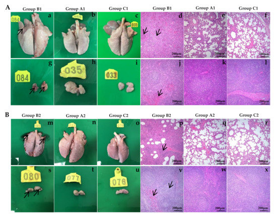 Gross and histological lesions of lungs and lymph nodes from SD-R immunization and challenge with parental virus SD group (A) and NADC30-like PRRSV HLJWK108-1711 group (B). Consolidation and/or oedema in the lungs in groups B1 and B2 (a and m), and hemorrhage in the lymph nodes in groups B1 and B2 (g and s) were observed when compared with groups A1 and A2 (b and n; h and t) and groups C1 and C2 (c and o; i and u). Compared with groups A1 and A2 (e and q) and groups C1 and C2 (f and r), a large amount of inflammatory cell infiltration, epithelial cell proliferation and significant alveolar diaphragm widening in the lungs were observed in groups B1 and B2 (d and p). Compared with groups A1 and A2 (k and w) and groups C1 and C2 (l and x), mild lymphocytopenia and medullary hemorrhage were observed in parts of the lymphoid nodules in groups B1 and B2 (j and v).