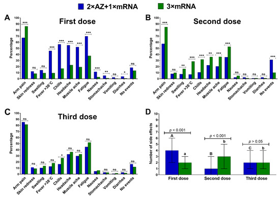 (A–C) Side effects reported in both groups after each vaccine dose. Asterisks indicate statistically significant differences in frequency between the groups (* p < 0.05; ** p < 0.01; *** p < 0.001; ns–not significant, p > 0.05); (D) The number of side effects (median and interquartile range) after each vaccine dose in the homologous and heterologous groups. Different capital letters indicate a significant difference between particular doses in the 2 × AZ + 1 × mRNA group, while different small letters indicate a significant difference between particular doses in the 3 × mRNA group (Kruskal–Wallis ANOVA with Dunn’s post-hoc test).
