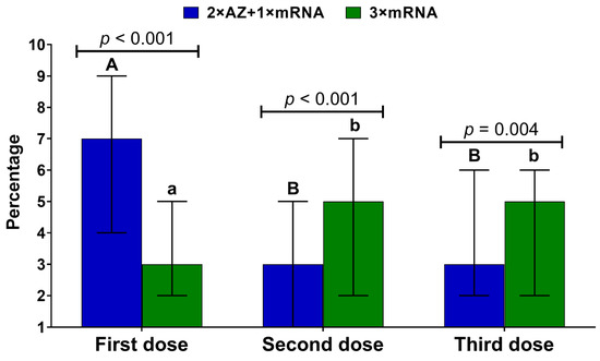 Side effects’ nuisance level (median and interquartile range) after each vaccine dose measured using a 10-point Likert scale in the homologous and heterologous groups. Different capital letters indicate a significant difference between particular doses in the 2 × AZ + 1 × mRNA group, while different small letters indicate a significant difference between specific doses in the 3 × mRNA group (Kruskal–Wallis ANOVA with Dunn’s post-hoc test).