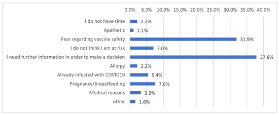 Our survey revealed that participants who were well informed about COVID-19 vaccines were more likely to accept vaccination. Similar findings were reported by another study conducted in five European countries [11]. However, a better generic knowledge of or positive attitudes towards vaccination in general terms had no association with acceptance or hesitancy. Moreover, major reasons for vaccine hesitancy included inadequate information about COVID-19 vaccines and possible vaccine side effects. Most studies worldwide depict similar results [30,31,35,43,45], which underlines the need for specific and continuous information regarding COVID-19 vaccination, in order to improve relative knowledge and reduce concerns about safety and effectiveness.