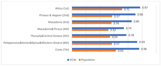 According to data from the National Vaccination Registry, at the time of our survey, the countrywide proportion of COVID-19 vaccination in the general adult population was approximately 42% [24]. A strong positive correlation was identified between the percentage of vaccinated PHCC personnel and vaccinated adults in the general population (at least one dose) in each health district (Spearman’s correlation coefficient ρ = 0.991, p < 0.001) (Figure 2 and Table 5).