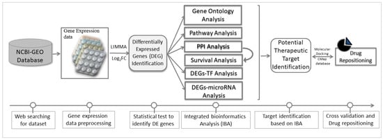 To reach the goal of this study, we analyzed a publicly available gene expression dataset by using integrated bioinformatics approaches [,,]. The global working flowchart of this study is displayed in Figure 1.