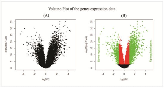Gene expression profile of microarray data. (A) The volcano plot which represents the scatter plot of log2FC values versus −log10(adjusted p-values). (B) The volcano plot highlighting DEGs, where green bullets represent the upregulated (adjusted p-value < 0.001 and log2FC > 1) and downregulated (adjusted p-value < 0.001 and log2FC < −1) DEGs selected based on the described criteria.