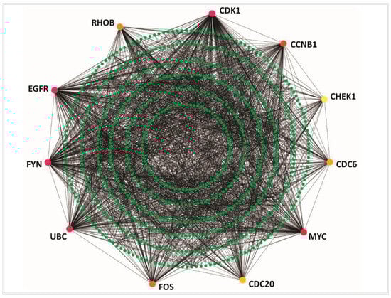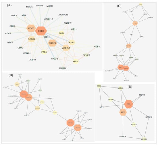 To detect the basic mechanism of disease, the protein–protein interaction network analysis is becoming a promising approach []. The PPI network analysis in this study revealed the hub-DEGs’ encoded hub-proteins. The CDK1 is related to the cell cycle activities. Up-regulation of CDK1 genes may be indicative of poor survival rates and a higher risk for cancer recurrence. The CDK1 gene is also related to several other cancer diseases [,]. The EGFR gene is associated with cell growth and had a contribution in lung cancer studied before [,]. The study revealed that the growth is suppressed and the radiosensitivity is amplified by the activities of ubiquitin C (UBC) in NSCLC cells [,,,]. The CDC6, CDC20, and CHEK1 genes are closely related to the occurrence and development of small-cell lung cancer, and CHEK1 is treated as a therapeutic target for lung cancer []. Eight hub genes (CDK1, EGFR, UBC, MYC, CCNB1, RHOB, CDC6, and CDC20) have tumor suppressor functions, while five hub genes (CDK1, EGFR, FYN, UBC, and CCNB1) are protein kinases as well. The MCODE cluster analysis clearly showed that the hub genes were distributed among the distinguished sub network (Figure 4) modules, which provided the strong evidence about the proposed signature biomolecules that these are reliable as therapeutic targets. Thus, the predicted hub-DEGs and relevant information might be useful in early detection of NSCLC. On the other hand, the genomic alteration/mutation analysis of the hub-DEGs reflected that most mutation for the EGFR occurred across the four lung cancer studies and was followed by the MYC and CHEK1 genes, since EGFR is a highly mutant/altered gene for lung cancer and NSCLC as well []. The alteration/mutation frequency revealed that the EGFR showed the highest alteration frequency relative to others, including the mutation, where CHEK1 represented mutation and deletion across the studies (Supplementary Figure S1), which may be a concern of investigation in future research.