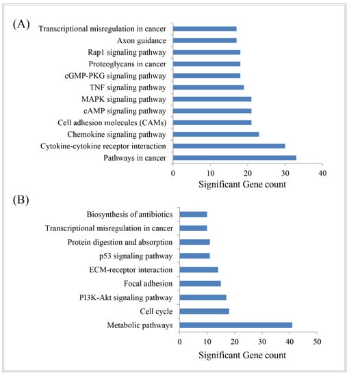 DAVID (version v6.8) revealed the molecular function, biological process, and molecular pathway annotations of the identified DEGs through the gene over-representation analysis. The significant GO terms were retrieved, which included the biological processes, molecular function, and cellular components (Table 2). The significant GO terms are summarized and presented in Table 2 for upregulated and downregulated genes separately. The significant functional pathways obtained from the KEGG Pathway analysis are also shown in Figure 5 for the hub-DEGs. The pathways in cancer, cytokine–cytokine receptor interaction, chemokine signaling pathway, cell-adhesion molecules (CAMs), cAMP signaling pathway, MAPK signaling pathway, and TNF signaling pathway are the significant pathways shared by the upregulated genes (Figure 5A). The metabolic pathways, cell cycle, PI3K-Akt signaling pathway, focal adhesion, and ECM-receptor interaction key pathways are exhibited by the downregulated genes (Figure 5B).