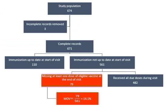 After excluding children who were up to date at the time of exit interview (110) and those with incomplete records (4), the remaining 561 children were included as denominator for the MOV analysis. Of these, 79 (14.1%) experienced MOV in at least one eligible vaccine dose. Figure 1 below illustrates the estimation of MOV prevalence. Variations in the prevalence of MOV were observed across a number of individual- and facility-level variables.
