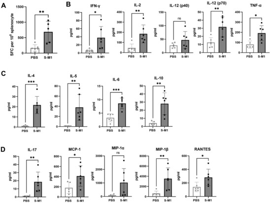 Cellular immune responses were assessed by the quantification of S-specific T cells in the spleen (Figure 6A) using ELISpot. A significantly increased number of S-specific T cells was observed in the vaccinated group compared to the control group. This systemic response may have been the reason for the significant effect of the VLP vaccination on viremia. Cytokines released by splenocytes pulsed with overlapping peptides covering the entire length of the SARS-CoV-2 S protein were measured. Figure 6B,C show the elevated Th1 (Figure 6B) and Th2 cytokine levels (Figure 6C) and the increased levels of the chemokines involved in T-cell and monocyte chemotaxis (Figure 6D) compared to those of control mice. These results suggest that S-M1 VLP triggered a balanced Th1/Th2 response. Baseline concentrations of Th1/2 cells and inflammatory cytokines were also detected in splenocytes obtained from SARS-CoV-2-challenged control mice, possibly as part of the innate immune mechanism in response to the primary viral infection.