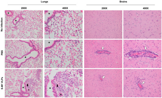 Histopathological analyses of S-M1 VLP vaccinated mice. Tissue samples were collected post mortem and embedded in paraffin. The samples were then sectioned and stained with hematoxylin-eosin. * indicates airway, + indicates blood vessel, black arrows indicate peribronchiolar accumulation of lymphocytes, plasma cells, and histiocytes. White arrows indicate Virchow–Robin spaces expanded by lymphocytes and plasma cells.