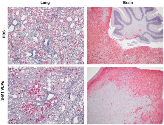 Histopathological analyses were performed on the tissues of the challenged mice. The lungs of both animals inoculated with PBS and S-M1 VLPs showed mild to marked lymphoplasmacytic and histiocytic pulmonary inflammation. Photomicrographs of the lungs show perivascular and peribronchiolar accumulations of lymphocytes, plasma cells, and histiocytes. Additionally, alveolar macrophages were scattered within the airways (Figure 7). Notably, it is unusual that the PBS group in this study had such a low lung pathology (Figure 7). The clinical observations, ISH results, and laboratory findings correlate with an adequate response to a challenge/disease, but the lung pathology is minimal or even normal in some mice. However, there was mild to marked lymphoplasmacytic and histiocytic pneumonia in only two of the inoculated animals. Overall, the lesions are typically regionally variable. Within the central nervous system, the lymphoplasmacytic and histiocytic inflammation were noted in both the PBS and S-M1 VLPs groups, resulting in the expansion of the vascular walls within the multifocal vessels in the cerebrum (Figure 7). The vasculature was obscured by significant numbers of histiocytes, lymphocytes, and plasma cells, as well as rare neutrophils which largely expanded the Virchow–Robin space and infiltrated the adjacent parenchyma. There was multifocal gliosis, rare satellitosis, and multifocal parenchymal edema in areas adjacent to the inflammation, suggesting a robust inflammatory response leading to encephalitis.