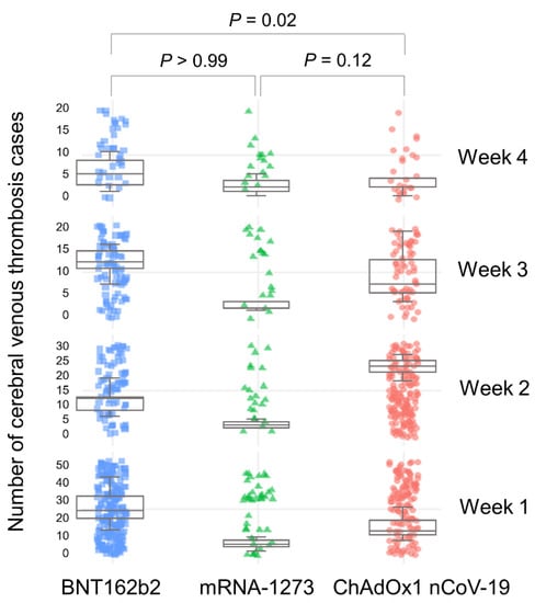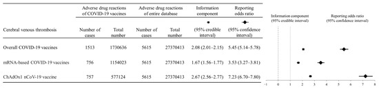Chicago/Turabian StylePark, Jin, Moo-Seok Park, Hyung Jun Kim, and Tae-Jin Song. 2022. "Association of Cerebral Venous Thrombosis with mRNA COVID-19 Vaccines: A Disproportionality Analysis of the World Health Organization Pharmacovigilance Database" Vaccines 10, no. 5: 799. https://doi.org/10.3390/vaccines10050799