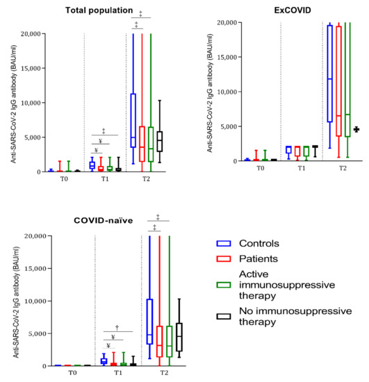 Boxplots representing anti-SARS-CoV-2 IgG antibody titers prior to the first (T0) and second (T1) vaccine dose and after 4 weeks (T2) in controls, total patients, patients under active immunosuppressive therapy, and patients without immunosuppressive therapy. The total population (ex-COVID plus COVID-naïve) and ex-COVID and COVID-naïve subjects are represented in each graph, respectively. † = p < 0.01, ‡ = p < 0.001, and ¥ = p < 0.0001 compared with the COVID-matched controls at the same time point by Mann–Whitney test.