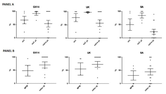 Neutralizing activity against the SARS-CoV-2 wild-type (G614), United Kingdom (UK), and South African (SA) variants. (Panel A) The analysis included 5 controls (-ctrl- 3 with previous COVID-19 –exC-), 5 ex-C patients (of which 2 were treated with mycophenolate mofetil (MFM) at 3 g/day, 2 with baricitinib at 4 mg/day, and 1 with methotrexate at 15 mg/week), and 12 COVID-naïve patients (naïve pt), of which 2 treated with MFM at 3 g/day, 2 with baricitinib at 4 mg/day, 2 with methotrexate at 15 mg/week, 2 with secukinumab at 150 mg/4 weeks, and 4 with adalimumab at 40 mg/2 weeks. (Panel B) Data are shown for the patients treated with MFM versus other immunosuppressants (other IS). Each black spot represents a patient, the bars indicate means and standard errors of the mean (SEM) of the percentages of cytopathic effect compared to the positive infection control.