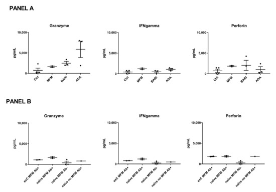 Cytotoxic marker levels. (Panel A) Patients included in this analysis were treated with mycophenolate mofetil (MFM, n = 2) at 3 g/day, baricitinib (BARI, n = 3) at 4 mg/day, and adalimumab (ADA, n = 3) at 40 mg/2 weeks. The patients and controls (ctrl, n = 4) were all COVID-naïve. (Panel B) Patients (n = 8) were compared based on MFM treatment, seroconversion status (Ab+ = seroconverted, Ab- = not seroconverted), and previous history of COVID-19 (previous COVID-19= ex-C or COVID-naïve=-naïve). Each black spot represents a patient, the bars indicate means and standard errors of the mean (SEM) of the marker levels.
