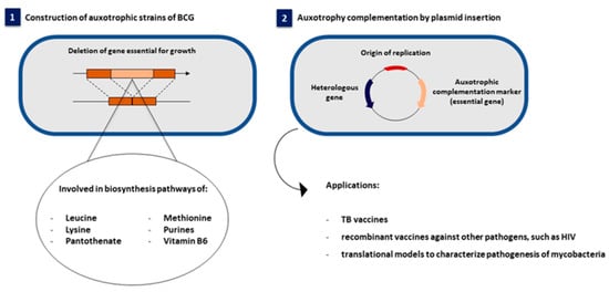 Moreover, the use of antibiotic resistance markers in vectors used for the genetic transformation of BCG, which does not maintain selective pressure in vivo, limits vaccine stability and compromises the induction of long-lasting immune responses [10]. Alternatives to overcome antibiotic resistance have focused on the use of auxotrophic markers. Auxotrophic strains require external supplementation with essential compounds for their growth. The selection is performed using an expression vector containing the gene that complements the strain mutation (Figure 1) and restores the ability of BCG to grow in minimal medium without exogenous supplementation [11,12,13]. The use of auxotrophic complementation as a selectable marker generally provides higher stability rates in vivo, as the selective pressure for the vector is maintained and eliminates the problem of having an antibiotic resistance gene as part of the vector.
