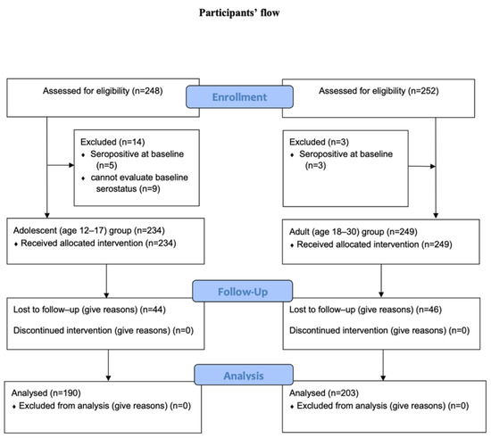 From 14 September 2021 to 5 October 2021, 248 adolescent participants were assessed for eligibility. Fourteen participants were excluded (five because of a seropositive status at baseline and nine because of the inability to evaluate the baseline serostatus). For the adult cohort, 252 participants aged 18 to 30 years were assessed for eligibility. Three were excluded because of a seropositive status at baseline. Finally, 234 participants in the adolescent cohort and 249 in the adult cohort received the study vaccine and underwent the safety profile analysis. All participants in the study received both doses of the study vaccine. However, 4 weeks after the second vaccination, only 393 (81.4%) participants were followed up for the primary outcome analysis (190 in the adolescent cohort and 203 in the adult cohort). The participant flow chart is shown in Figure 1.