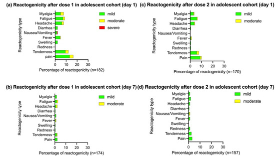 Reactogenicity on days 1 and 7 after the BBIBP-CorV vaccination in the adolescent cohort (age of 12–17 years). Pain, tenderness, redness, and swelling were defined as local reactogenicity. Fever, nausea or vomiting, diarrhea, headache, fatigue, and myalgia were defined as systemic reactogenicity. n: number of participants who responded to the questionnaire. (a) Reactogenicity on day 1 after dose 1. (b) Reactogenicity on day 7 after dose 1. (c) Reactogenicity on day 1 after dose 2. (d) Reactogenicity on day 7 after dose 2.