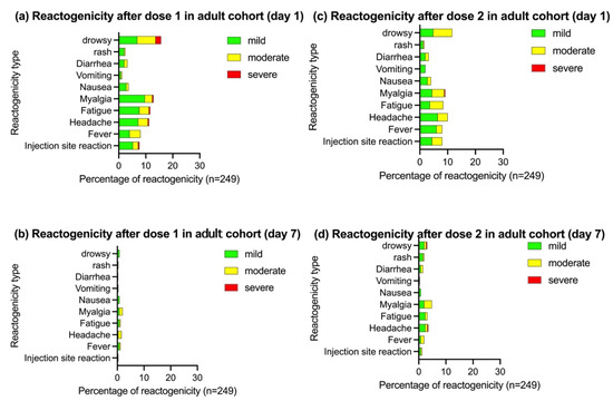 Seven participants in the adult cohort reported nine severe reactogenicities (injection site reaction in one participant, headache in one, fatigue in one, myalgia in one, and drowsiness in five). However, all symptoms resolved within 1 week. On day 1 after the second dose, the reactogenicity was 12.4% in the adolescent cohort and 14.1% in the adult cohort. All participants’ reactions were mild to moderate in severity except one reaction in the adult cohort; this participant reported severe myalgia that spontaneously resolved. No serious AEs were reported during the follow-up period.