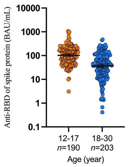 Our study also found that the younger participants had a more robust immune response than older or adult participants. This finding may be due to the weight dependence of the vaccine. This finding can also be found with the BNT162b2 vaccine, the participants aged 5–11 received the lower amount of vaccine but had a similar immune response [9].