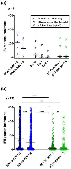 - Smith, J.G.; Liu, X.; Kaufhold, R.M.; Clair, J.; Caulfield, M.J. Development and validation of a gamma interferon ELISPOT assay for quantitation of cellular immune responses to varicella-zoster virus. Clin. Diagn. Lab. Immunol. 2001, 8, 871–879. [Google Scholar] [CrossRef]