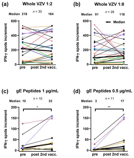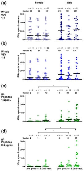 Varicella-zoster virus-specific ELISpot responses in female and male hematopoietic stem cell transplant recipients prior to and after the first and second vaccination with Shingrix™. Panel (a) displays responses to a whole VZV antigen (Behring), used at a dilution of 1:2, and panel (b) at a dilution of 1:8. Panel (c) displays responses to a peptide pool of glycoprotein E (gE) from JPT, used at concentration of 1 µg/mL per peptide, in panel (d) at 0.5 µg/mL. Open circles indicate females and filled circles males. In females and males blood sampling was performed at a median of 33 and 39 months after transplantation, respectively. In females the median interval between first vaccination and blood sampling was 53 days, and between second vaccination and blood sampling it was 84 days. In males, the respective intervals were 80 and 78 days. VZV-specific spots were determined as stimulated minus non-stimulated (background) values (spots increment). Horizontal lines represent median values. Data were compared by Mann–Whitney test (* p < 0.05).