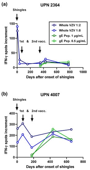 - Cassaniti, I.; Ferrari, A.; Comolli, G.; Sarasini, A.; Gregorini, M.; Rampino, T.; Lilleri, D.; Baldanti, F. Characterization of Varicella-Zoster (VZV) Specific T Cell Response in Healthy Subjects and Transplanted Patients by Using Enzyme Linked Immunospot (ELISpot) Assays. Vaccines 2021, 9, 875. [Google Scholar] [CrossRef]