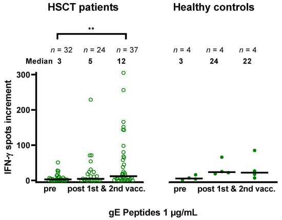 Furthermore, considering the first sample of each HSCT patient tested prior to vaccination and after the first and second vaccination, we analyzed if gE-specific ELISpot responses increased after vaccination (Figure 4). Of note, this analysis considered also incomplete data sets, in contrast to the paired data, as shown in Figure 2. Using 1 µg/mL per gE peptide, we could detect a statistically significant increase in cellular responses after the second vaccination in HSCT patients (p < 0.005). VZV gE-specific ELISpot responses prior to and post vaccination were compared between HSCT patients and four healthy controls. Prior to vaccination, VZV-specific ELISpot responses towards the gE peptide pool were comparable. However, after the first and second vaccination with Shingrix™, cellular responses were 4.8-fold and 1.8-fold higher in the age-matched healthy controls vs. HSCT patients (median of spots increment 24 vs. 5 and 22 vs. 12, respectively).