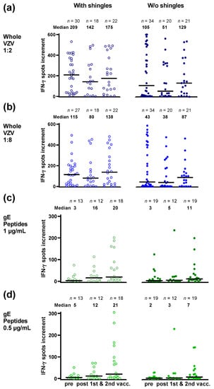 Varicella-zoster virus-specific ELISpot responses in hematopoietic stem cell transplant (HSCT) recipients prior to and after the first and second vaccination with Shingrix™. Panel (a) displays responses to a whole VZV antigen (Behring), at a dilution of 1:2, and panel (b) at a fourfold higher dilution of 1:8. Panel (c) displays responses to a peptide pool of glycoprotein E (gE) from JPT, used at concentration of 1 µg/mL per peptide, in panel (d) at 0.5 µg/mL. Open circles (left panel) indicate recipients with shingles and filled circles (right panel) without (w/o) shingles. In patients with and without shingles blood sampling was performed at a median of 35 and 37 months after transplantation, respectively. In patients with and without shingles the median interval between first vaccination and blood sampling was 80 and 61 days and between second vaccination and blood sampling 79 and 78 days, respectively. VZV-specific spots were determined as stimulated minus non-stimulated (background) values (spots increment). Horizontal lines represent median values.