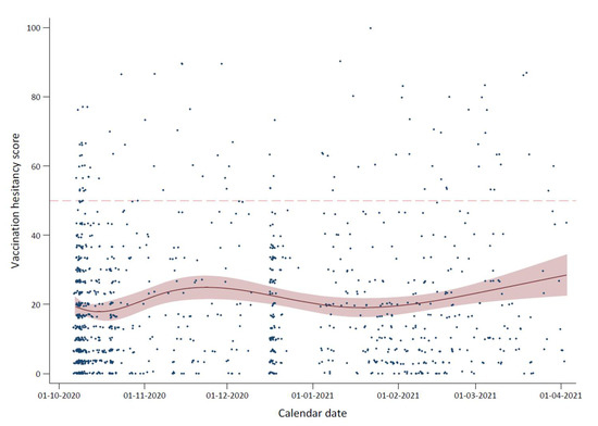The mean PACV score was 20.4 (SD = 18.9) points across the 1095 parents, and there was a slight non-linear increasing trend (p-value of increase = 0.006) in the mean score with time from October 2020 to April 2021 (Figure 1). The prevalence of parental vaccine hesitancy defined as a PACV score of more than 50 points was 8.9% (95% CI: 7.3, 10.8, N = 98) after combining the possibly (51–70; 6.3%) and probably hesitant (71–100; 2.6%) categories. The standardized prevalence of vaccine hesitancy by age, using the stratified Greek population as the standardization data, was 9.1%.