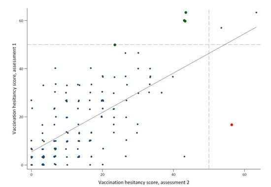 Comparison of childhood vaccine hesitancy score between first assessment and second assessment, for the 156 participants who answered the PACV questionnaire a second time. The Y- and X-axes represent the continuous vaccine hesitancy score from the first and the second assessment, respectively. The horizontal and vertical dashed lines show the cut-off points of vaccine hesitancy.